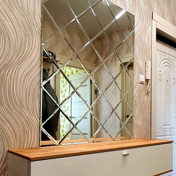 Использована квадратная серебристая зеркальная плитка размером 18х18.